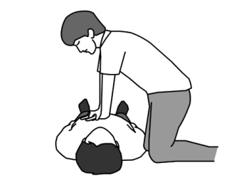 4. 确认患者没有正常呼吸,将一只手的掌根放在患者胸部的中央(两乳头连线中点),将另一只手的掌根置于第一只手上,伸直双臂,双肩位于双手正上方。按每分钟100至120次频率,用力按压, 按压深度5至6厘米。